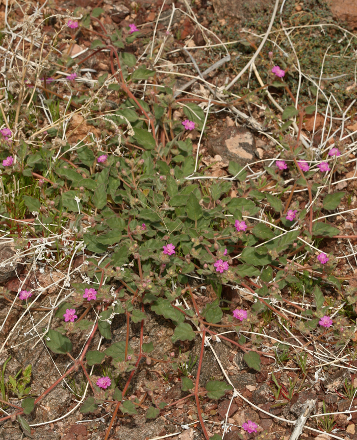 Allionia, commonly known as windmills or trailing four o'clock, is a genus of two species widespread in the western hemisphere. They are unusual in their blooms, which actually consist of three separate flowers appearing to be a single flower. The plants are finely pubescent annuals or short-lived perennials, with trailing stems up to a metre in length, often threading through other vegetation. The leaves range from oval to oblong, under 4 cm long. The inflorescences are axillary, consisting of three red-purple flowers symmetrically arranged and superficially seeming to be a single flower 3-15 mm across. The individual flowers are bisexual, bilaterally symmetric, with a distinct oblique funnel. The 5-7 stamens may be somewhat exserted, along with the style. The fruits have five ribs.
