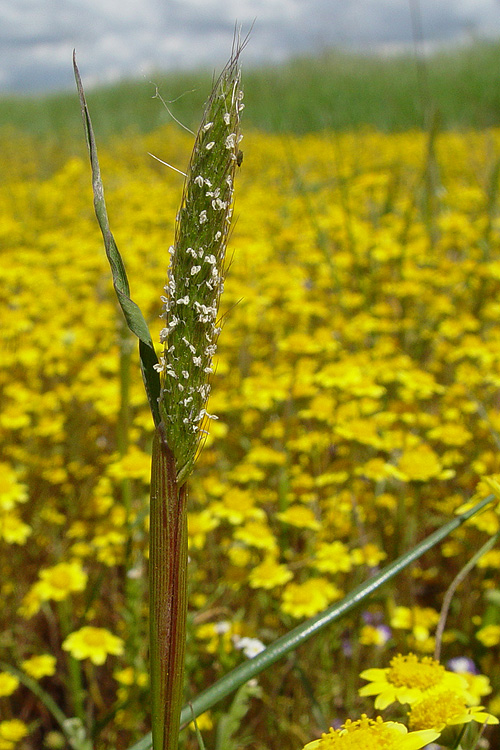 Alopecurus saccatus is a species of grass known by the common name Pacific foxtail, or Pacific meadow foxtail. It is native the west coast of the United States from Washington to California, where it grows in moist areas at low elevations. Alopecurus saccatus is an annual bunchgrass, forming tufts of stout, erect stems up to about 45 centimeters in maximum height. Leaves are up to 12 or 13 centimeters long. The inflorescence is a dense panicle up to 6 or 7 centimeters long which blooms in yellow to reddish brown anthers.