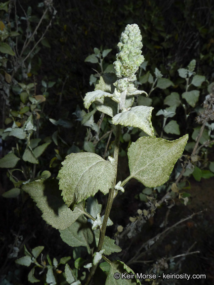 Ambrosia chenopodiifolia is a species of ragweed known by the common name San Diego Burrsage or San Diego Burr Ragweed. It is native to Baja California, and California as far north as San Diego County, where it is a member of the coastal sage scrub plant community. This is a thickly branching shrub exceeding 3 meters in maximum height. The leaves are ovals up to 3 centimeters long and coated in white hairs. They are sometimes lobed. Like other ragweeds it is monoecious, with each flower cluster bearing heads of pistillate (female) flowers below a cluster of staminate (male) flowers. The flower cluster is spiny, especially when in fruit. The fruit is a spherical, woolly bur about half a centimeter long covered in hooked spines.