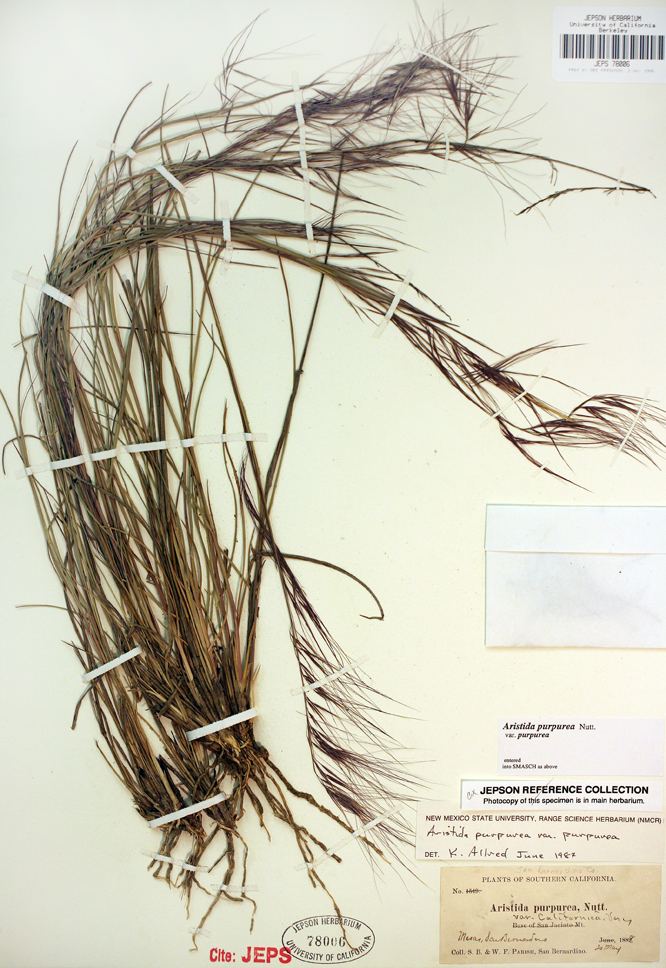Purple Threeawn (Aristida purpurea var. purpurea) is a native grass that grows in southern and central California. It tends to grow in sandy rocky soils, slopes and plains, at elevations from 800-2600 feet.