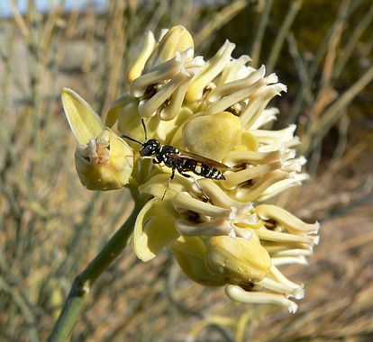 Asclepias subulata is a species of milkweed known commonly as the rush milkweed or ajamete. This is an erect perennial herb which loses its leaves early in the season and stands as a cluster of naked stalks. Atop the stems are flower clusters of distinctive flowers. Each cream-white flower has a reflexed corolla that reveals the inner parts, a network of five shiny columns, each topped with a tiny hook. The fruit is a pouchlike follicle that contains many flat, oval seeds with long, silky hairlike plumes. This milkweed is native to the desert southwest of the United States and northern Mexico.