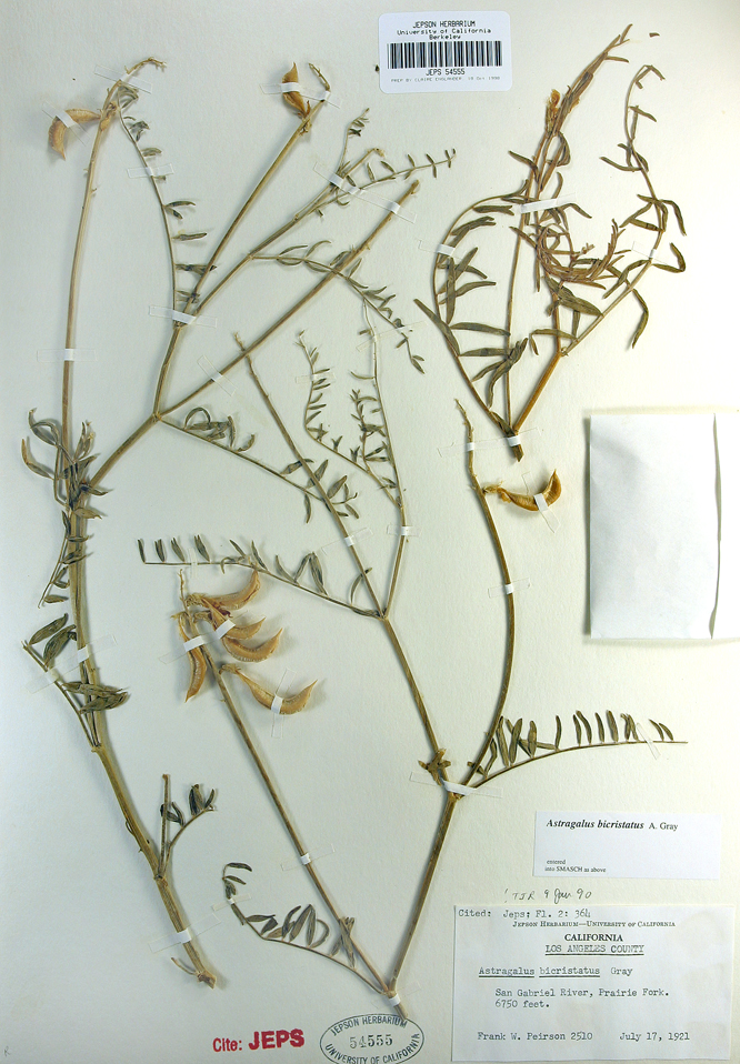 Astragalus bicristatus is a species of milkvetch known by the common names crested milkvetch and two-crested milkvetch. It is endemic to southern California, where it grows in the coniferous forests of the San Gabriel and San Bernardino Mountains of the Transverse Ranges. Astragalus bicristatus is a perennial herb sprawling outwards with stems to a maximum length approaching half a meter. The leaves are up to 14 centimeters long and are made up of very widely spaced narrow linear leaflets. The stems and foliage have sparse grayish hairs, giving them a rough texture. The inflorescence is a loose array of up to 20 pealike flowers. Each flower is between 1 and 2 centimeters long and is purple-tinted white to light greenish yellow. Astragalus bicristatus is a perennial herb sprawling outwards with stems to a maximum length approaching half a meter. The leaves are up to 14 centimeters long and are made up of very widely spaced narrow linear leaflets. The stems and foliage have sparse grayish hairs, giving them a rough texture. The inflorescence is a loose array of up to 20 pealike flowers. Each flower is between 1 and 2 centimeters long and is purple-tinted white to light greenish yellow. The fruit is a hanging capsule 2 to 4 centimeters long and curved or crescent-shaped. It is fleshy when immature and leathery to woody when dried.