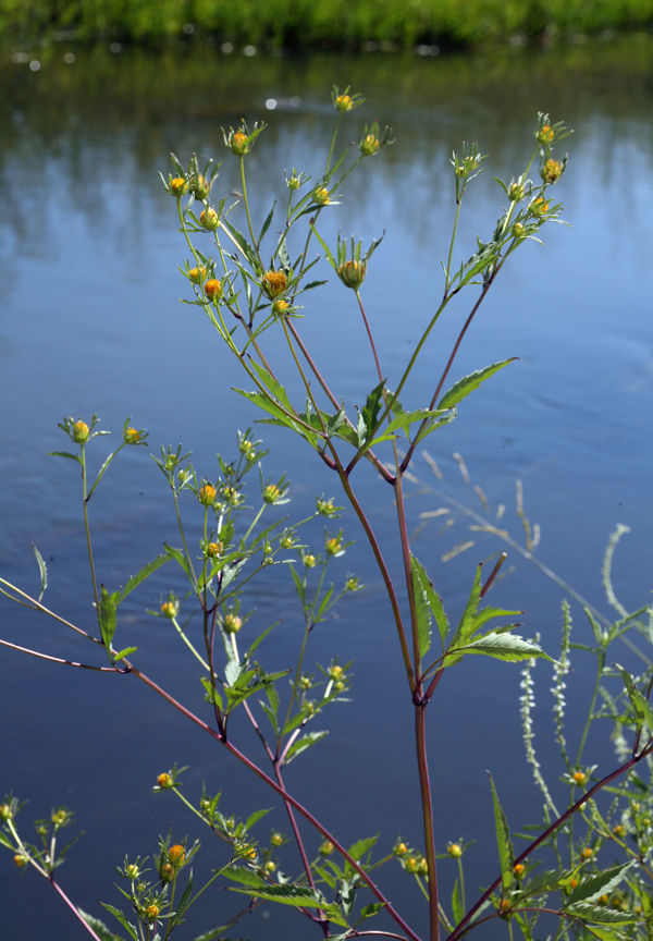 Bidens frondosa is a North American species of flowering plant in the aster family, sunflower family. It is widespread across much of Canada, the United States, and Mexico It is known in many other parts of the world as an introduced species, including Europe, Asia, Morocco, and New Zealand. Its many common names include devil's beggarticks, devil's-pitchfork, devil's bootjack, sticktights, bur marigold, pitchfork weed, tickseed sunflower, leafy beggarticks, and common beggar-ticks. Bidens frondosa is annual herb is usually about 20 to 60 (8-20 inches) centimeters tall, but it can reach 1. 8 meters (72 inches or 6 feet) at times. The stems are square in cross-section and may branch near the top. The leaves are pinnate, divided into a few toothed triangular or lance-shaped leaflets usually up to 6 or 8 centimeters long, sometimes up to 12. The inflorescence is often a solitary flower head, but there may be pairs or arrays of several heads. The head contains many orange disc florets. It often lacks ray florets but some heads have a few small yellow rays. The fruit is a flat black or brown barbed cypsela up to a centimeter long which has two obvious hornlike pappi at one end. The barbed pappi on the fruit help it stick to animals, facilitating seed dispersal. Ecology. The defoliating caterpillar of Hadjina chinensis, which is limited to Bidens species, has been observed on this plant. Invasive species. This plant is invasive in some parts of the world. In New Zealand it is classed as an environmental weed by the Department of It is also weedy in its native range, occurring in pastures and fields and along roadsides.