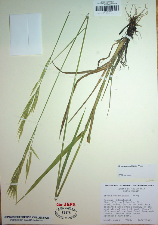 Bromus orcuttianus is a species of brome grass known by the common name Orcutt's brome. It is native to western North America from Washington to Baja California, where it grows in many types of habitat. It is a perennial grass which may reach 1.6 meters in height. The flower cluster is an open array of spikelets, the lower ones drooping or nodding. The spikelets are flattened and have short awns at the tips of the fruits.