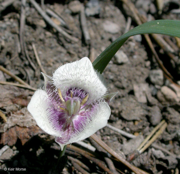 Calochortus elegans is a species of flowering plant in the lily family known by the common name elegant Mariposa lily and cat's ear. It is native to the western United States from northern California to Montana. It is a perennial herb producing a slender, generally unbranched stem up to 15 centimeters in height. The basal leaf is 10 to 20 centimeters long and does not wither at flowering. The inflorescence bears 1 to 7 erect bell-shaped flowers. Each flower has three sepals and three petals with very hairy inner surfaces and edges. Each petal is greenish white in color with a purple crescent above a hairless patch at the base. The fruit is a winged capsule about 2 centimeters long.