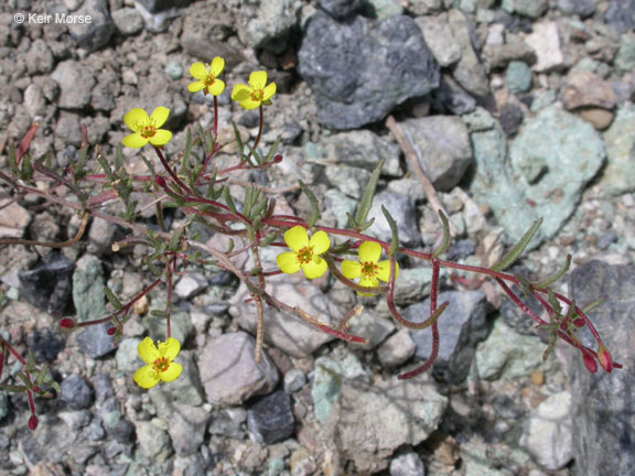 Camissonia contorta is a species of evening primrose known by the common name plains evening primrose. It is native to western North America from British Columbia to California to Idaho, where it grows in many habitat types. It is an annual herb producing a slender, bending to curling red or green stem which is sometimes hairy. It is up to 30 centimeters long and erect or spreading out. The blue-green leaves are linear to very narrowly oval in shape and up to 3. 5 centimeters long. The nodding inflorescence produces one or more small flowers. Each has bright yellow petals up to half a centimeter long, sometimes with small red dots near the bases. The fruit is a capsule about 3 centimeters long containing shiny seeds.