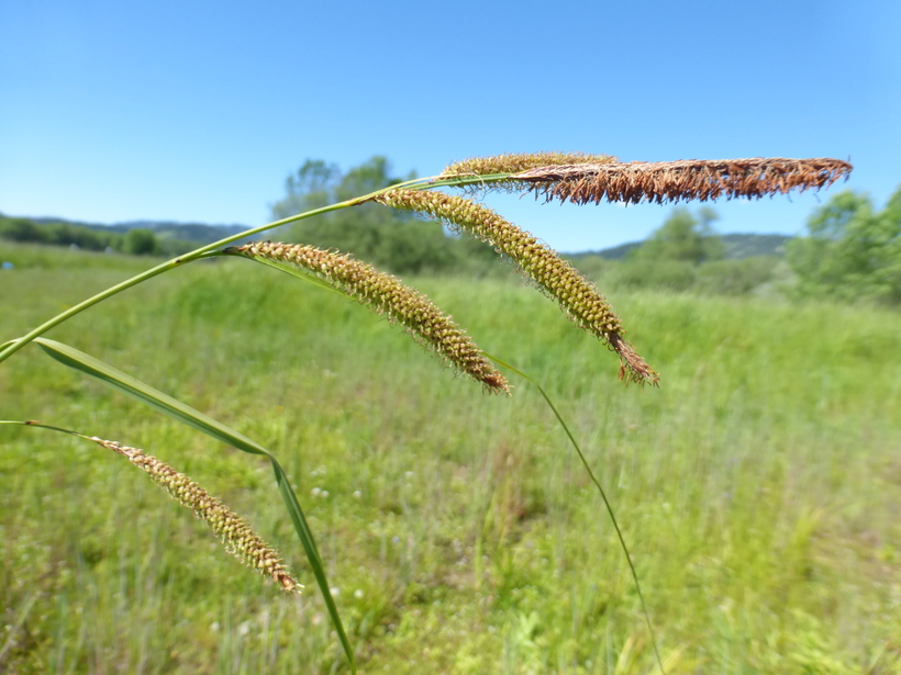 Carex barbarae is a species in the Cyperaceae (Sedge) family known by the common names Valley Sedge and Santa Barbara Sedge. Despite its common name it is not limited to the Santa Barbara area and is native to a large part of California and Oregon, where it grows in wet and seasonally wet habitat, such as meadows and riverbanks. This sedge produces angled, hairless stems up to one meter tall or slightly taller. The tough leaves are narrow with shredding, red-spotted or purple basal sheaths. The flower cluster produces erect and drooping spikes up to about 8 centimeters long with an associated long leaf which exceeds the length of the spikes. The fruits are covered in a sac called a perigynium which is light to dark brown and sometimes red-spotted, leathery and tough, and sometimes with a toothed, hairy tip. The plant rarely matures into a fruiting stage, however, with most individuals remaining sterile. Parts of this sedge are used in basketry and as sewing fiber by California Native American groups such as the Maidu and Pomo. Use caution in deciding where to use this plant because it can be an aggressive spreader wherever there is moisture. Its tendency to spread can be controlled by planting in a container. It is useful on the margin of a pond or in a bioswale.
