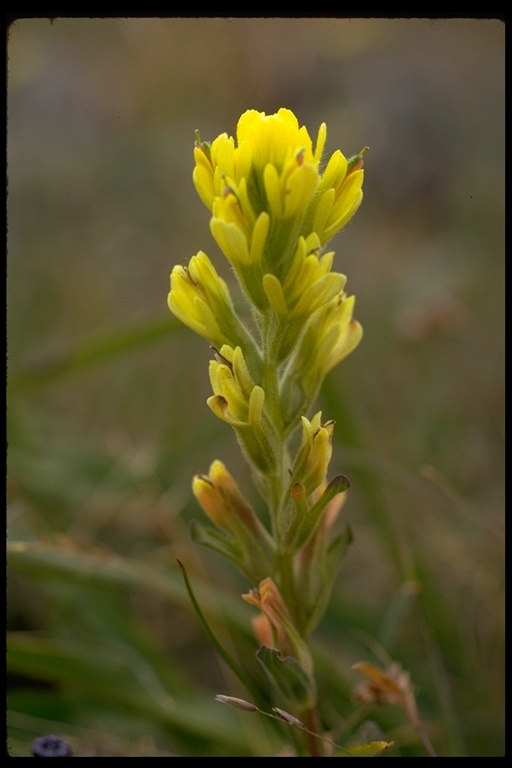 The Tiburon paintbrush or Tiburon Indian paintbrush (Castilleja neglecta syn. for Castilleja affinis spp. neglecta) is an endangered taxon of flowering plant in the broomrape family, Orobanchaceae. It is endemic to the San Francisco Bay Area in California in the United States, where it occurs in Marin, Napa, and Santa Clara Counties. This plant is listed as threatened by the state of California and endangered by the United States government. This plant is a perennial herb with a bristly green and purplish stem 15 to 60 centimeters tall. The lance-shaped leaves are 2 to 4 centimeters long and lobed or not. The inflorescence is up to 2. 5 centimeters wide and has bracts in shades of yellow, sometimes to pink or reddish orange. The flowers are roughly 2 centimeters long and vary from green to purple with red or yellow margins. The plant grows on serpentine soils below 300 meters in elevation.