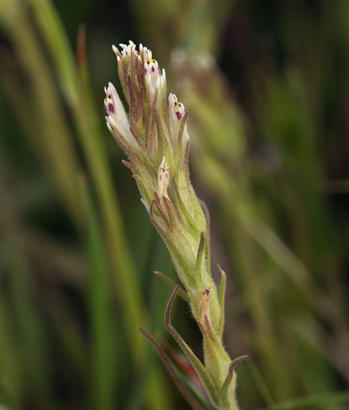 Castilleja attenuata is a species of Indian paintbrush, known by the common names valley tassels and attenuate Indian paintbrush. It is native to western North America from British Columbia, through California, to Baja California, where it grows in grasslands and open woodland habitats. Castilleja attenuata is an annual herb growing up to about 50 centimeters tall. The leaves are linear in shape and several centimeters long. The inflorescence has three-lobed bracts with yellow or white tips. Between the bracts emerge fuzzy white flowers dotted with purple and yellow.