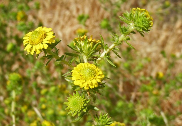 Centromadia pungens, the commmon spikeweed or common tarweed, is a species of North American plants in the tarweed tribe within the sunflower family. It is native to northern Baja California and the western United States (California, Oregon, Washington, Idaho, Nevada, Arizona). The plant is considered a noxious weed in parts of the Pacific Northwest. Centromadia pungens is an herb up to 120 cm (48 inches) tall. It produces arrays of numerous yellow flower heads with both ray florets and disc florets.