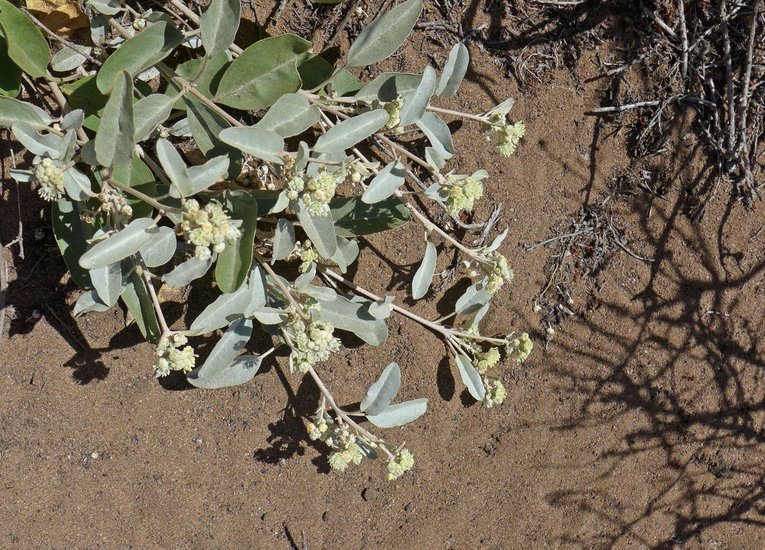 Croton californicus is a species of croton known by the common name California croton. This plant is a perennial or small shrub not exceeding a meter in height. The plant produces long oval-shaped leaves a few centimeters long and covered in a light-colored coat of hairs. This species is dioecious, with individual plants bearing either male (staminate) or female (pistillate) flowers, both only a few millimeters across. The staminate flowers are tiny cups filled with thready yellowish stamens and the pistillate flowers are the rounded, lobed immature fruits surrounded by tiny pointed sepals. This plant is native to California, Nevada, Utah, Arizona, and Baja California, where it grows in the deserts and along the coastline.