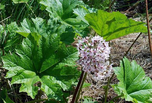Darmera peltata (Indian rhubarb or, ambiguously, "umbrella plant") is the only species within the genus Darmera in the family Saxifragaceae. It is a slowly-spreading rhizomatous perennial from mountain streamsides in woodland in the western United States (southwestern Oregon to northwestern California). In late spring the flowers emerge before the leaves, with rounded cymes of numerous five-petalled white to bright pink flowers (measuring up to 1.5 centimeter across each) borne on flower stems up to 2 meter long. The leaves are peltate, rounded, deeply lobed, coarsely-toothed, conspicuously veined and dark green, also on stems up to 2 meter in height. The leaves turn red in autumn.
