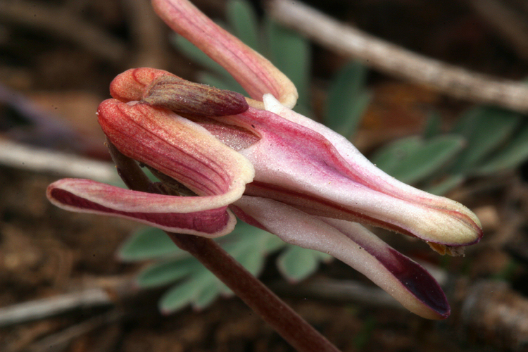Dicentra uniflora (longhorn steer's head) is a herbaceous perennial growing from a tuber, native to gravelly soils in mountains of the western United States. Height is up to 10 centimetres (4 in). Leaves are leaves are long-stalked and 3-times compound with rounded leaflets. Each leaflet is deeply divided. Height is up to 10 centimetres (4 in). Leaves are leaves are long-stalked and 3-times compound with rounded leaflets. Each leaflet is deeply divided. Flowers have pink to white petals tinged with light brown or purple. The two outer petals are bent back; the inner petals are fused at the tip. Seeds are borne in a capsule a little more than a 1 centimetre (0. 4 in) long.