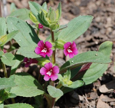 Diplacus bolanderi is a species of monkeyflower known by the common name Bolander's monkeyflower. It is endemic to California, where it grows in the chaparral and other habitat in the coastal and inland mountains and foothills from the North Coast Ranges to the Sierra Nevada to the Transverse Ranges. This is a hairy annual herb producing an erect stem reaching maximum heights anywhere from 2 to 90 centimeters. The lance-shaped to oval leaves are up to 6 centimeters long and arranged in opposite pairs about the stem. The base of the flower is encapsulated by a hairy ribbed calyx of sepals with pointed lobes. The flower has a tubular throat and a wide, five-lobed mouth. It is 1 to 3 centimeters long and pink in color, usually with blotches of white in the throat.