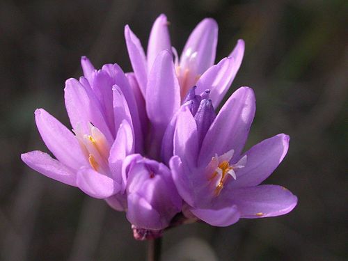 The flower cluster is head- or umbel-like, and dense. It usually contains 2 to 15 flowers, which have a blue, blue-purple, pink-purple, or white perianth. The flower tube is 0.1-0.5 inch and is narrowly cylindrical to bell-shaped. Flowers have six fertile stamens, deeply notched, lance-shaped, white, angled inward, slightly reflexed at tip, with outer filaments wider at the base. It has a twisted and fleshy peduncle, a set of membranous, petal-like stamen appendages around the anthers, and angular black seeds.