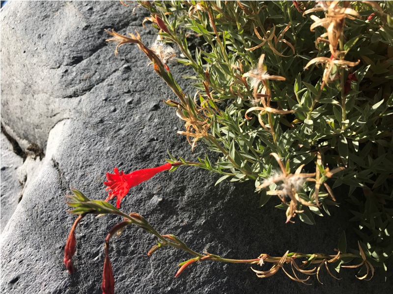 The genus Epilobium in the Onagraceae (Willowherb or Evening Primrose) family includes numerous species. Epilobium septentrionale is a rare species (CNPS list 4.3) known by the common names Humboldt County Fuchsia and Northern Willowherb. Plants in this genus were once treated as members of genus Zauschneria, and some sources still refer to it by that name. This species is endemic to northern California, where it is an uncommon resident of the rocky ledges of the Cascades. It is a squat, clumpy perennial growing in thin patches of soil between rocks and sending up a few erect stems. The leaves are oval and pointed, hairy, and covered in a coat of white fuzz. At the end of each erect branch is a hairy flower cluster bearing a bright red-orange tubular flower 2-3 centimeters long. A bunch of stamens and one long pistil protrude obviously from the mouth of the bloom, which is pollinated by nectar-feeding birds. The fruit is a hairy capsule about two centimeters long. This plant would be a good choice for the north coast garden. For other regions, other species in this genus are available.