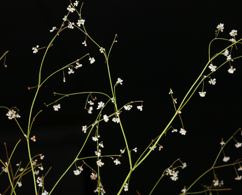Eriogonum cernuum is a species of wild buckwheat known by the common name nodding buckwheat. It is native to much of western North America, where it grows in sandy and gravelly habitat, including woodland and sagebrush. It is an annual herb growing up to about 60 centimeters in maximum height with a thin, branching flowering stem. The rounded, woolly leaves are one or two centimeters wide and are mainly located about the base of the stem. The inflorescence is evenly lined with hanging involucres of flowers. The individual flowers are less than 2 millimeters wide and white to pink-tinged in color.