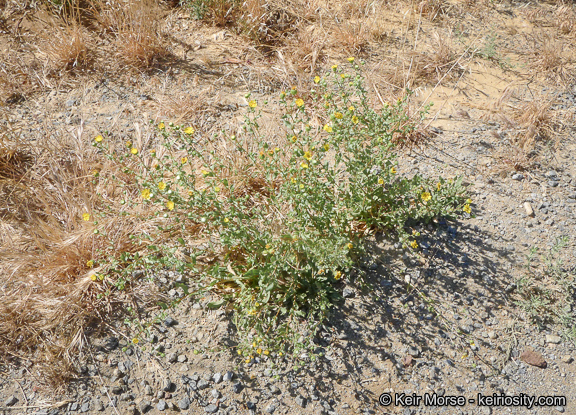 Grindelia hirsutula is a North American species of flowering plant in the daisy family known by the common names hairy gumplant and hairy gumweed. Grindelia hirsutula is native to North America, widespread across Canada and in California and Oregon. The species is highly variable, and many local populations have been named as varieties or as distinct species. All these taxa do, however, intergrade with one another. Grindelia hirsutula is an erect perennial herb or subshrub sometimes as much as 250 cm (100 inches or 8 1/3 feet) tall but usually much shorter. The plant is usually green but the stems are often red or purplish-brown and the leaves can be somewhat yellowish to reddish. The plant can produce numerous flower heads in branching arrays at the top of the plant. Each head is 2 or 3 centimeters (0. 8-1. 2 inches) wide with hemispheric cups of greenish phyllaries around the base, the bracts claw-like and bent away from the flowers. The center of the head is filled with many small yellow disc florets surround by numerous golden ray florets. The head produces a thick white exudate, especially in new flower heads. Varieties: Grindelia hirsutula var. maritima - San Francisco Gum Plant, San Francisco gumplant, coastal gumweed; endemic to coastal California in the San Francisco Bay Area.
