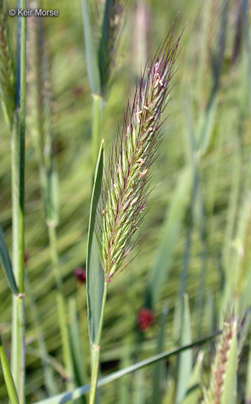 Hordeum brachyantherum is a species of barley known by the common name meadow barley. It is native to western North America from Alaska to northern Mexico, far eastern Russia, and parts of eastern North America. It can be found in other parts of the world as an introduced species. This is a tufting perennial grass approaching a meter in maximum height. It produces compact, narrow flower clusters 8 to 10 centimeters long and purplish in color. Like other barleys the spikelets come in triplets. It has two small, often sterile lateral spikelets on pedicels and a larger, fertile central spikelet lacking a pedicel.