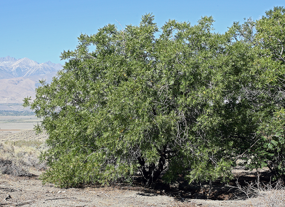 Northern California black walnut (Juglans hindsii) is a large, deciduous tree native to central and northern California. It often grows with a single, straight trunk, reaching heights of 30 to 60 feet with a broad, spreading crown. The tree produces smooth, brown nuts with thick shells and small edible nutmeats. It is commonly used as a rootstock for English walnut orchards worldwide, often hybridized as ‘Paradox’ (J. hindsii x J. regia).