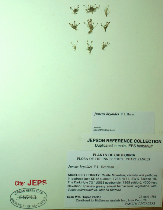 Juncus bryoides is a species of rush known by the common names moss rush and mosslike dwarf rush. It is native to western North America from Oregon to Baja California, where it grows in many types of wet, sandy habitat. It is a very tiny annual herb producing erect, hair-thin stems no more than about 2 centimeters tall. Atop the stem is one flower made up of a few reddish segments 1 to 3 millimeters long which curve around the developing fruit.
