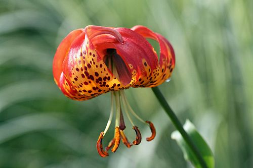 Lilium pardalinum, sometimes known as the panther lily or leopard lily, is a native of Oregon and California, where it usually grows in damp areas. In California it is found primarily in the central to northern part of the state in the Coast Ranges, Klamath mountains and Sierras. Typically it grows to about two meters high, the tallest and most vigorous plants can reach up to 2.5 meters. The flowers are Turk's-cap shaped, red-orange, with numerous brown spots, usually flowering in July. The plant grows from bulbs which are small, and many are usually clustered together on a rhizomatous stock.