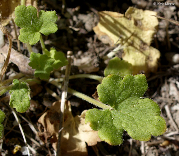 Lithophragma affine is a species of flowering plant in the saxifrage family known by the common name San Francisco woodland star. It is native to the coast of western North America from Oregon to Baja California, where it grows in open habitat on mountain slopes, hills, and canyonsides. It is a rhizomatous perennial herb growing erect or leaning with a tall naked flowering stem. The leaves are located on the lower part of the stem, each divided into sharp-pointed lobes. The stem bears up to 15 widely spaced flowers, each in a cuplike calyx of red or green sepals. The five petals are bright white, up to 1. 3 centimeters long, and divided into three toothlike lobes at the tips.