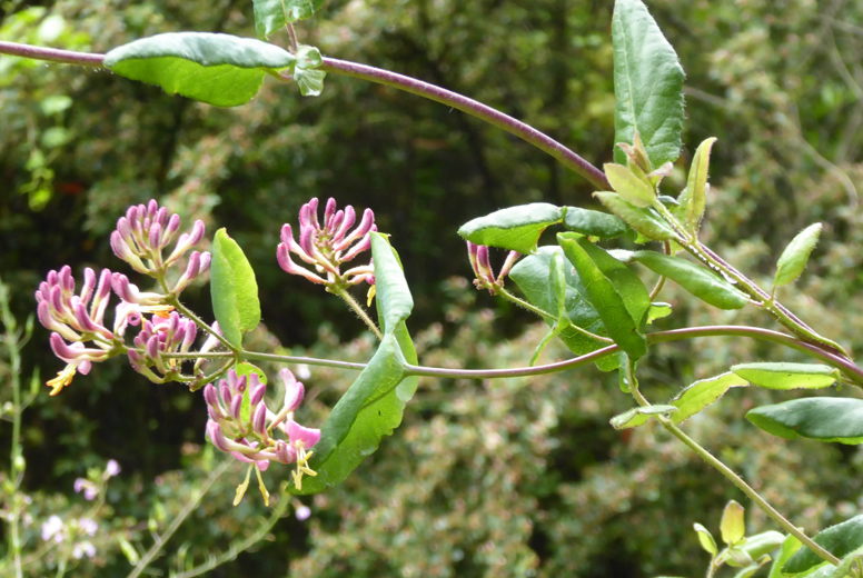 Pink honeysuckle, (Lonicera hispidula) also known as California honeysuckle, is a native vine or shrub in the Caprifoliaceae family. It grows along the coast from San Luis Obispo County northward, as well as in the Sierra foothills and parts of southern California. Typically found on slopes and streambanks at elevations up to 2,500 feet, this adaptable plant thrives in both moist year-round soils and drier summer conditions with minimal irrigation.