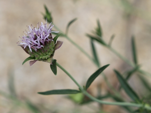 Monardella linoides is a species of flowering plant in the mint family (Lamiaceae) known by the common names flaxleaf monardella and narrow leaf monardella. It is native to southern California and adjacent sections of Nevada, Arizona, and Baja California, where it grows in many types of habitat from desert flats to subalpine forests. It is a gray-green perennial herb producing a slender erect stem up to about 50 centimeters in maximum height. The linear to oval leaves are 1 to 4 centimeters long and coated in grayish hairs. The flower cluster is a head of several flowers blooming in a cup of pale whitish or pink-tinged papery leafs 2 or 3 centimeters wide. The flowers are just over a centimeter long and light purple in color. There are several subspecies of this plant. One closely related separate species called Monardella viminea (willowy monardella), is a rare plant limited to northern Baja California and parts of San Diego, California. It is treated as a federally listed endangered species in the United States. All are low growing, highly aromatic herbs that like afternoon shade, look great in a rock garden and also do well in containers.