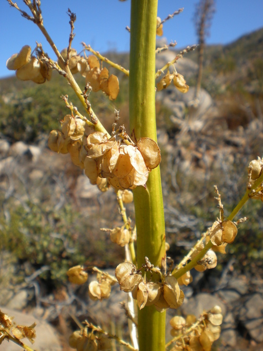Nolina cismontana, the chaparral beargrass, chaparral nolina, California beargrass, Peninsular beargrass, or peninsular nolina, is a rare species of flowering plant of the Peninsular and Transverse Ranges in California. It is endemic to (known from) only four counties in Southern California: Los Angeles, Orange, San Diego and Ventura Counties. There are perhaps 15 to 17 occurrences in existence, with a total population estimated between 10,000 and 20,000. This species, previously classified as a subspecies of Nolina parryi, was elevated to species status in 1995. The type specimen is from Trabuco Canyon. The two species differ in morphology as well as habitat and ecology. Nolina cismontana occurs in coastal mountain ranges in dry chaparral and coastal sage scrub habitat on rocky sandstone and gabbro substrates. By contrast, N. parryi is more often found in woodlands on granite soils. The plant is in decline throughout most of its range. Threats include destruction and fragmentation of habitat for development, construction of roads, and agriculture, changes in the fire regime, recreational activity, and non-native species. This species is a "fire-follower", experiencing reproduction and prolific blooming after wildfire. Nolina cismontana grows to 30 centimetres (0. 98 ft) in height but can be much taller, reaching well over 1 metre (3. 3 ft). At ground level is a rosette of 30 to 90 long, narrow leaves which measure up to 140 centimetres (4. 6 ft) long by 3 centimetres (0. 098 ft) wide with a widening at the bases. They are stiff, whiplike, or limp, sometimes waxy in texture, and serrated on the edges. The inflorescence is a compound panicle of whitish flowers interspersed with pointed bracts. The plant is dioecious, with male and female flowers occurring on separate plants.