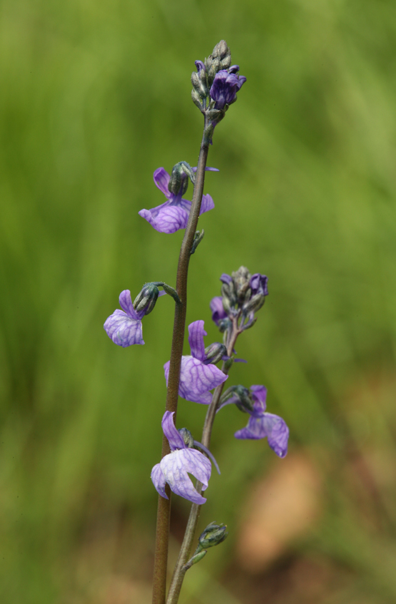 Blue toadflax (Nuttallanthus texanus) is an annual (occasionally biennial) wildflower in the Plantaginaceae (plantain) family. It features tiny violet to pale blue, two lipped flowers that bloom atop tall, slender stalks emerging from a basal rosette of narrow leaves. Native to much of the western United States, blue toadflax is commonly found in disturbed soils, but also thrives in dunes, grasslands, and open woodlands.