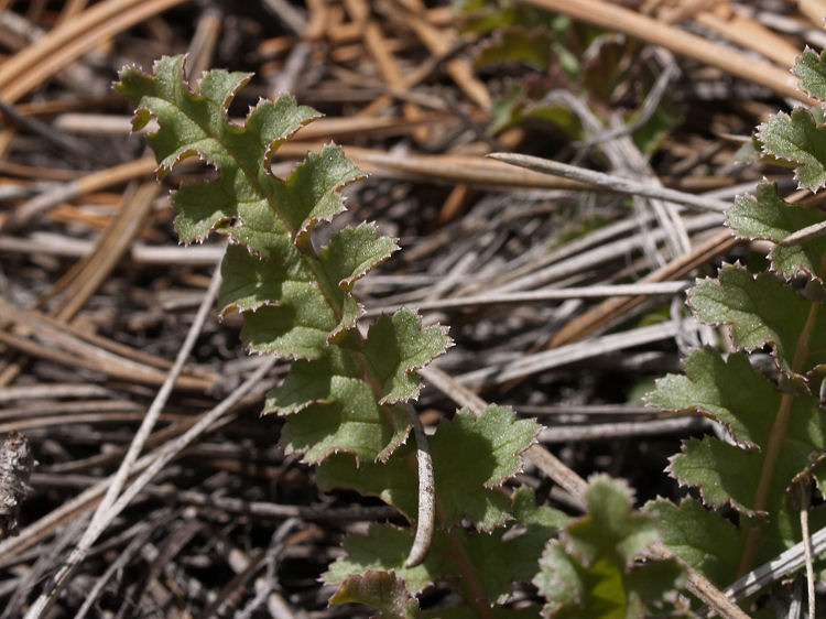 Pedicularis centranthera is a species of flowering plant in the broomrape family known by the common names dwarf lousewort and Great Basin lousewort. It is native to the western United States from eastern Oregon and California to Colorado and New Mexico, where it grows in sagebrush and other basin and plateau habitat. It is a perennial herb producing several short stems a few centimeters tall from a basal caudex. The leaves are up to 20 centimeters long, lance-shaped and divided into many overlapping toothed, wrinkled, or fringed lobes. The inflorescence is a short raceme bearing many long, protruding, club-shaped flowers. Each flower may exceed 4 centimeters in length and is white or pale purple with dark purple tips on the wide ends of its upper and lower lips. The sepals of the flowers are shorter and hairy. The fruit is a capsule around centimeter long containing seeds with netlike surfaces.