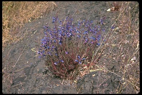 Penstemon laetus is a species of penstemon in the Plantaginaceae (Plantain) family known by the common names Gay Penstemon and Mountain Blue Penstemon. It is native to the inland mountains of Oregon and California, where its distribution extends from the Klamath Mountains through the Sierra Nevada to the Transverse Ranges. It is found at elevations from 750 ft. to over 8,000 ft. where grows in forest, scrub, and other mountain habitats. It is a perennial herb growing erect to about 75 centimeters tall, its base becoming woody. The leaves are linear to lance-shaped and up to 10 centimeters long. The hairy flower cluster bears blue or purple flowers up to 3.5 centimeters long. The wide-mouthed tubular or funnel-shaped flower is hairy on the outer surface and mostly hairless on the inside. There are two recognized varieties in California, all commonly known as Mountain Blue Penstemon.