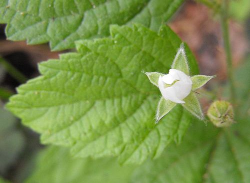 Rubus leucodermis (Blackcap Raspberry, Black Raspberry, or Whitebark Raspberry, and native: Blue Raspberry) is a species of Rubus native to western North America, from British Columbia, Canada south to California, New Mexico and Mexico. It is closely related to the eastern Black Raspberry Rubus occidentalis. It is a deciduous shrub growing to 0.5-2 meter tall, with thorny shoots. While the crown is perennial, the canes are biennial, growing vegetatively one year, flowering and fruiting the second and then dying. Like with other dark raspberries, the tips of the 1st year canes (primocanes) often grow downward to the soil in the fall, and take root and form tip layers which become new plants. The leaves are pinnate, with five leaflets on leaves strong-growing stems in their first year, and three leaflets on leaves on flowering branchlets with white, seldom light purple flowers. The fruit is 1-1.2 centimeter diameter, reddish-purple, dark blue to nearly black when ripe, and has high contents of anthocyanins and ellagic acid.