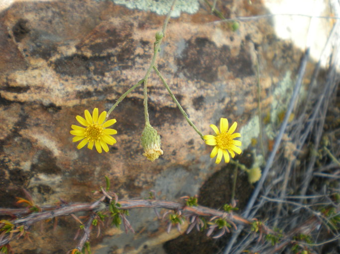 Machaeranthera juncea (syn. Xanthisma junceum) is a species of flowering plant in the aster family known by the common names rush bristleweed or rush-like bristleweed. It is native to northern Mexico and it occurs in the United States only as far north as San Diego County, California. It grows in coastal and inland slopes and canyons. It is a perennial herb growing erect to a meter in height. The linear leaves are mostly located at the base of the plant, each 1 or 2 centimeters long and toothed or cut into bristle-tipped lobes. The inflorescence bears one or more flower heads lined with glandular, bristle-tipped phyllaries. The head has a center of many yellow disc florets and a fringe of 15 to 25 yellow ray florets each about half centimeter long. The fruit is a hairy achene 2 to 3 millimeters long tipped with a pappus.